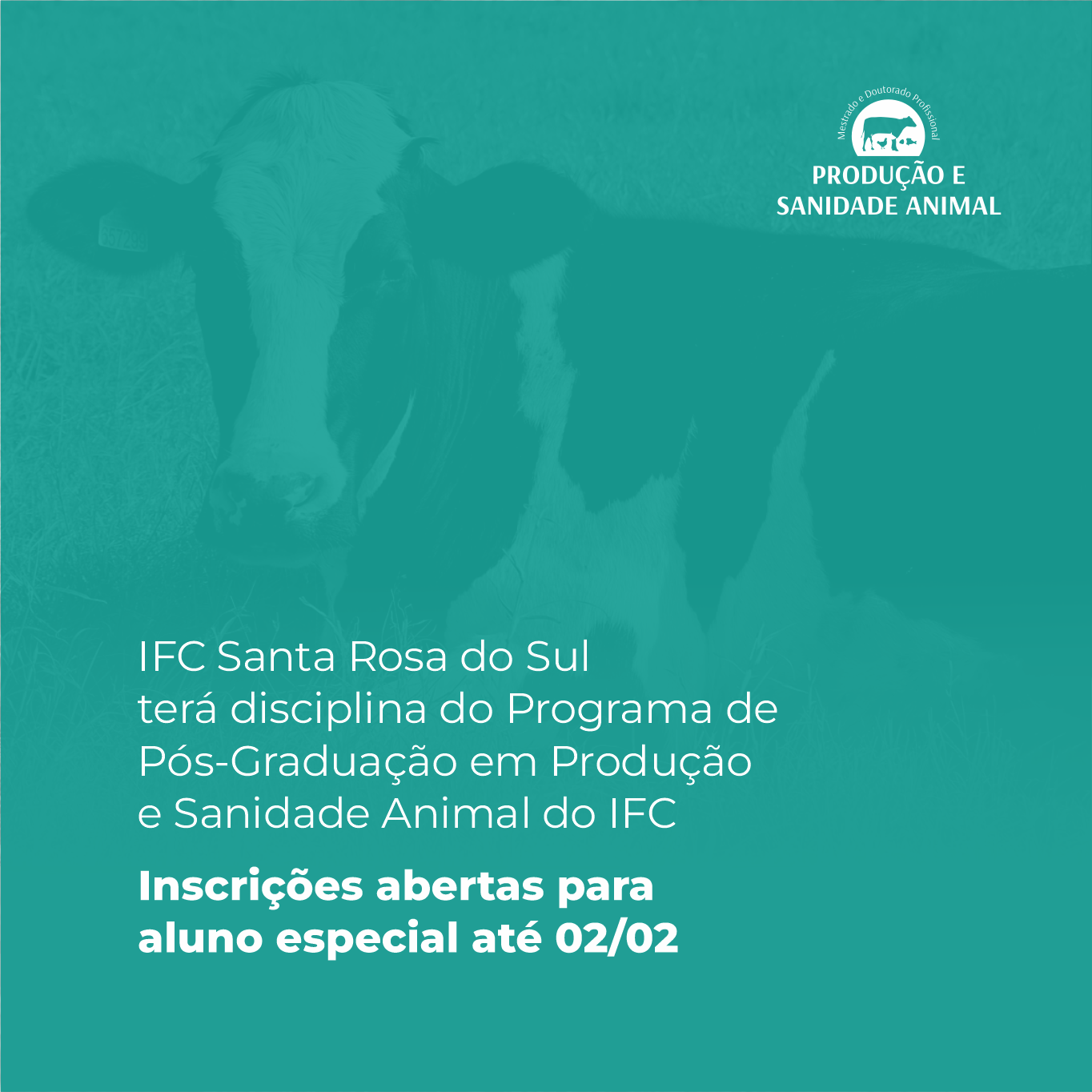 Você está aqui: Página inicial > Portal do campus Campus Santa Rosa do Sul > Notícias > IFC Santa Rosa do Sul terá disciplina do Programa de Pós-Graduação em Produção e Sanidade Animal do IFC; inscrições abertas para aluno especial até 02/02