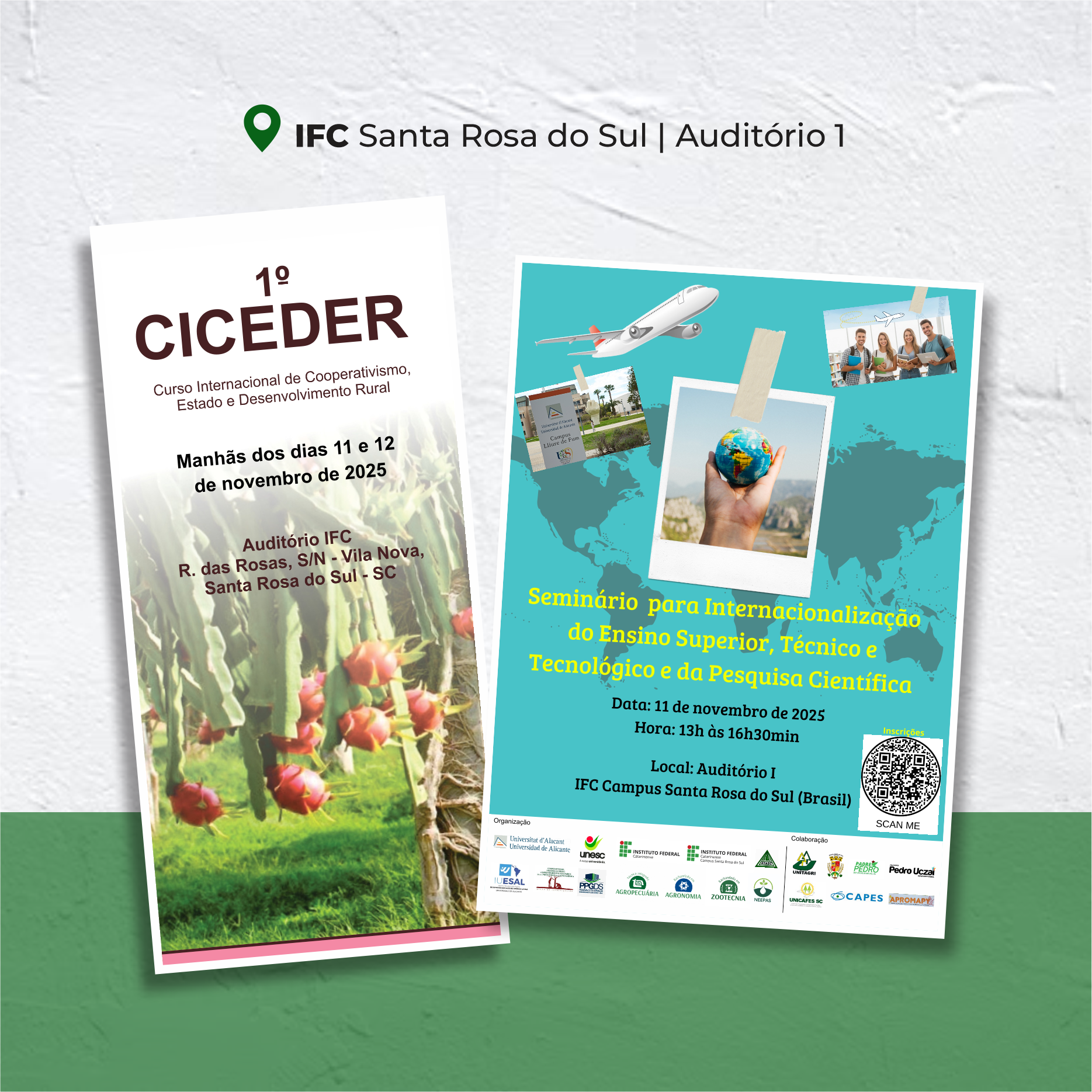 Nos dias 11 e 12 de novembro, o IFC Santa Rosa do Sul será palco de dois importantes eventos: o 1º Curso Internacional de Cooperativismo, Estado e Desenvolvimento Rural (CICEDER) e o 1º Seminário para a Internacionalização do Ensino Superior, Técnico, Tecnológico e da Pesquisa Científica. As atividades representam uma oportunidade de diálogo internacional e de troca de experiências entre instituições, pesquisadores e produtores. Ambos os encontros são gratuitos, abertos ao público e ocorrerão no Auditório I do campus.