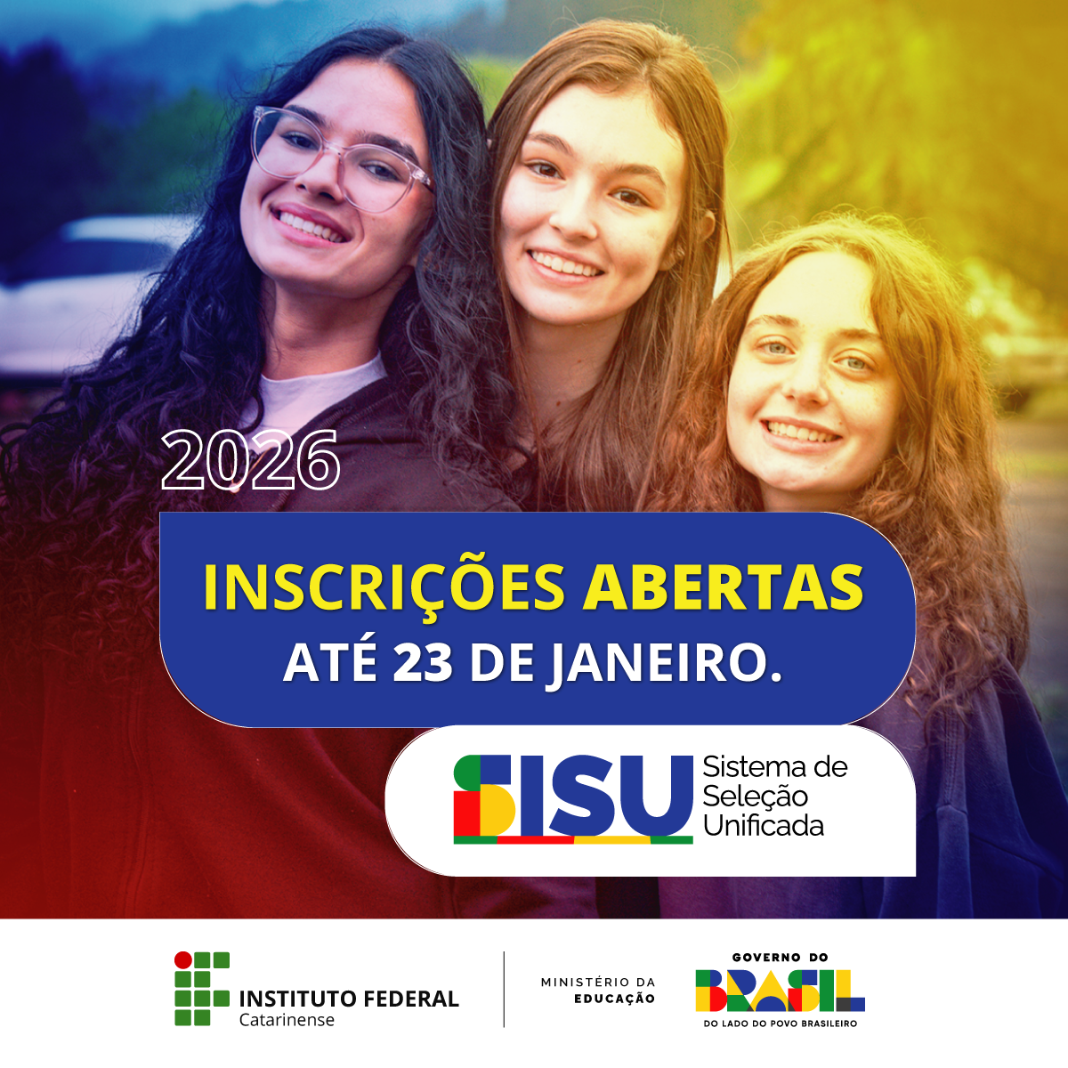 As inscrições para os cursos superiores de Graduação do Instituto Federal Catarinense (IFC) por meio do Sistema de Seleção Unificada (Sisu), com ingresso no primeiro e no segundo semestres de 2026, têm início nesta segunda-feira (19) e seguem até o dia 23 de janeiro.