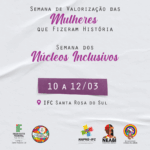 A I Semana de Valorização das Mulheres que Fizeram História e a I Semana dos Núcleos Inclusivos são organizadas pelo Núcleo de Apoio a Pessoas com Necessidades Específicas (Napne), pelo Núcleo de Estudos de Gênero e Sexualidade (Neges) e pelo Núcleo de Estudos Afro-brasileiros e Indígenas (Neabi) do IFC Santa Rosa do Sul.