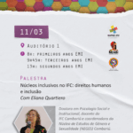 Na quarta-feira, 11 de março, a programação segue com a palestra “Núcleos inclusivos no IFC: direitos humanos e inclusão”, ministrada por Eliana Quartiero, doutora em Psicologia Social e Institucional, docente do IFC Camboriú e coordenadora do Núcleo de Estudos de Gênero e Sexualidade (Neges) local. A atividade será realizada em três momentos, voltados às turmas do ensino médio integrado: das 8h às 9h30, para as turmas de 1º ano; das 9h45 às 11h15, para as turmas de 3º ano; e das 13h às 14h30, para as turmas de 2º ano.