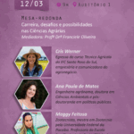 Já na quinta-feira, 12 de março, será realizada a mesa-redonda “Carreira, desafios e possibilidades nas Ciências Agrárias”, reunindo mulheres com diferentes trajetórias profissionais na área. Participam do debate Cris Werner, egressa do curso Técnico Agrícola do IFC Santa Rosa do Sul, empresária e comunicadora do agronegócio; Meggy Feitosa, zootecnista e mestra em Zootecnia pela Universidade Federal da Paraíba, professora da Escola Família Agrícola Padre Eliésio dos Santos, no Ceará; e Ana Paula de Matos, engenheira agrônoma, doutora em Ciências Ambientais e pós-doutoranda em políticas públicas. A mediação será realizada pela docente do IFC Franciele Oliveira, zootecnista e doutora em Produção Animal. A atividade ocorrerá das 9h às 10h30.