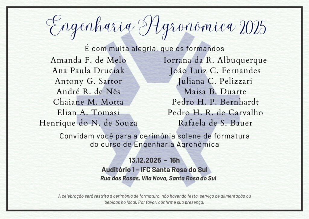 O Instituto Federal Catarinense (IFC) – Campus Santa Rosa do Sul realizará, no próximo sábado, 13 de dezembro de 2025, a solenidade de formatura do curso de Engenharia Agronômica. A cerimônia está marcada para às 16h, no Auditório I do Campus.