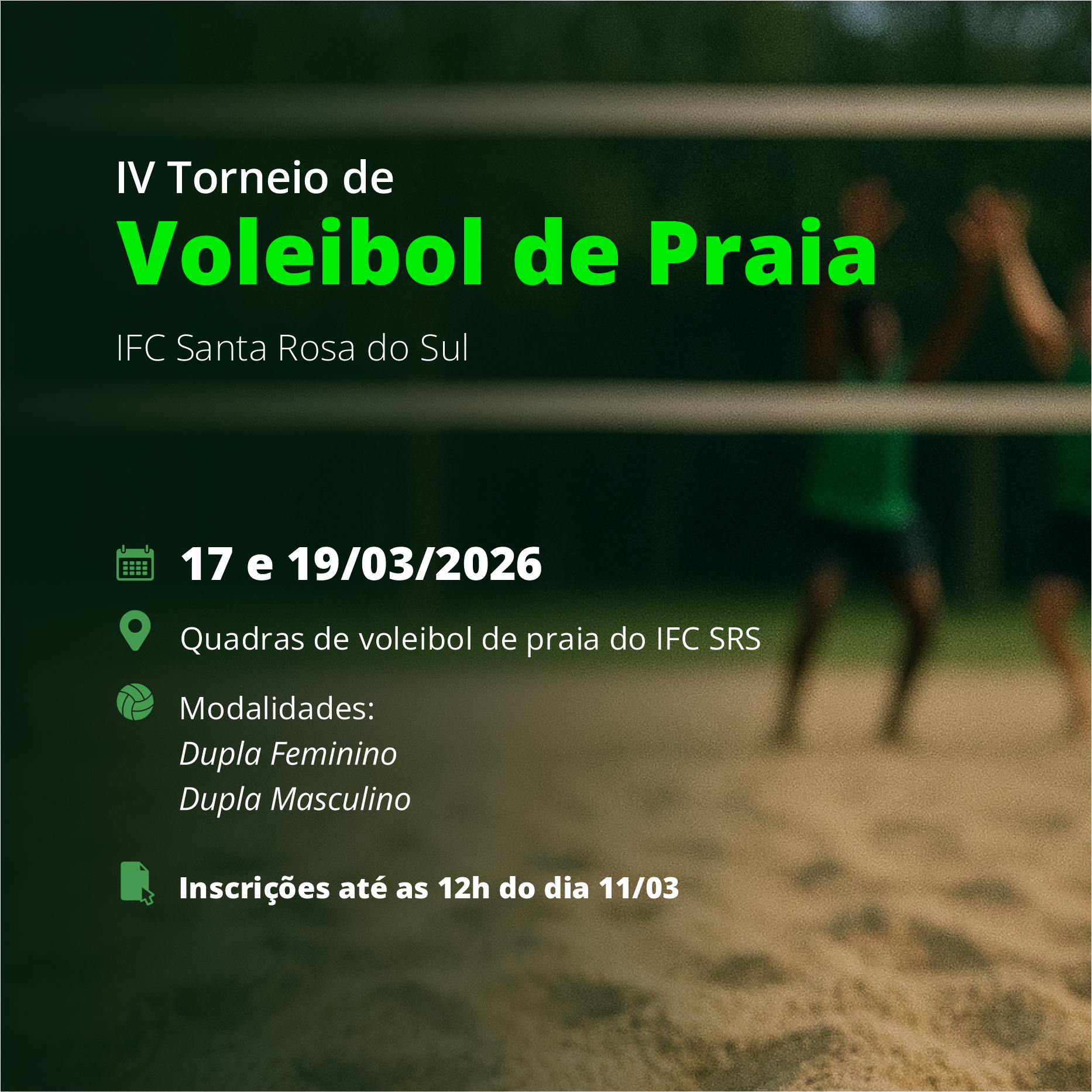 Vem aí o Torneio de Voleibol de Praia do IFC Santa Rosa do Sul! Em 2026, o evento chega à sua quarta edição com o objetivo de integrar estudantes e servidores, promovendo o bom convívio social e incentivando a prática esportiva no Campus.