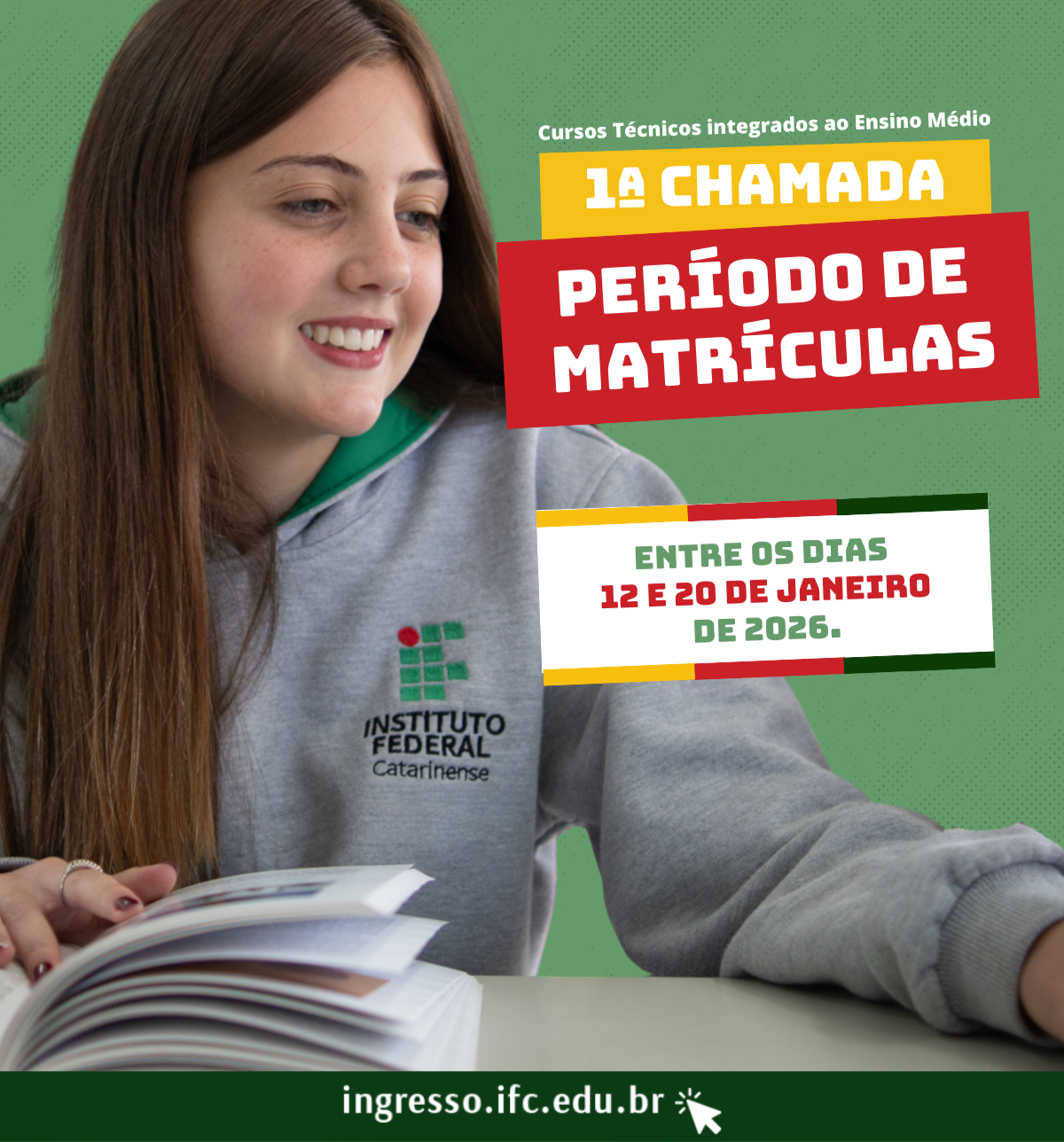 As matrículas dos aprovados(as) em primeira chamada para cursos técnicos integrados ao ensino médio do Instituto Federal Catarinense (IFC) tiveram início na última segunda-feira (12), e seguem até o dia 20 de janeiro. O procedimento é feito pela internet, por meio do Portal do Candidato da Instituição.